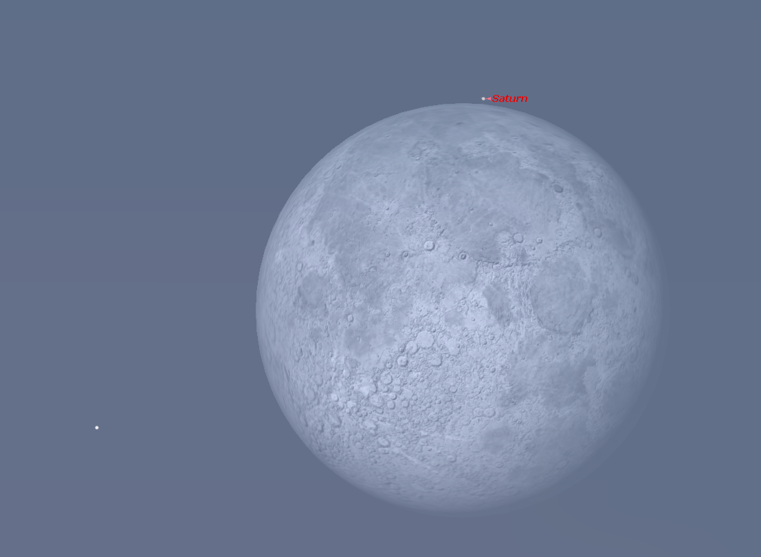 Månen okkulterer Saturn om morgenen på denne dag, en sjælden begivenhed, der burde kunne følges med det blotte øje og bedre med en prismekikkert, godt understøttet, eller et teleskop. Ovenstående skærmdump fra ”Starry Night College” viser, at Månen netop har passeret fuld fase.